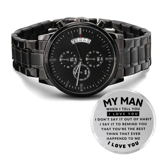 Gift For My Man | I Love You Engraved Design Black Chronograph Watch