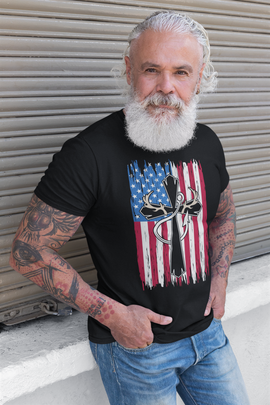 American Flag Cross Fishing Deer Hunter T-Shirt